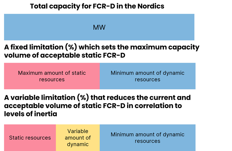 The reason is to ensure that the provision of FCR-D does not lead to unacceptable risks for operational security or unwanted effects on the frequency when activated. Only a certain amount of the total Nordic demand for FCR-D upward and downward regulation can consist of entities providing static FCR-D during the delivery hour.
